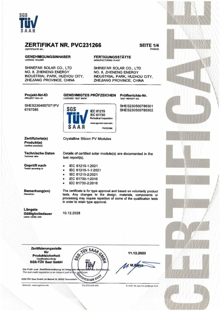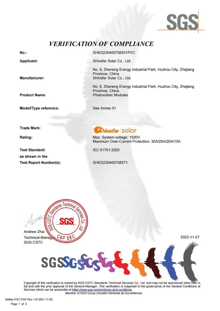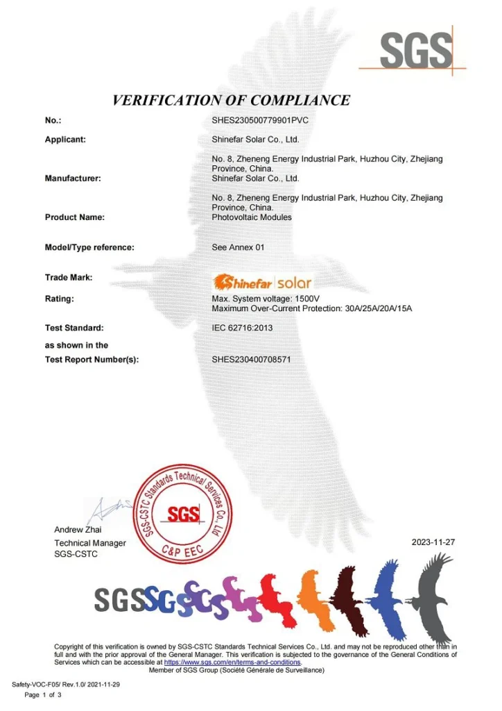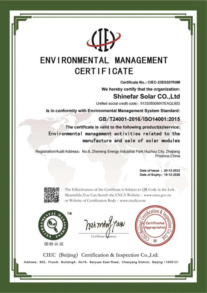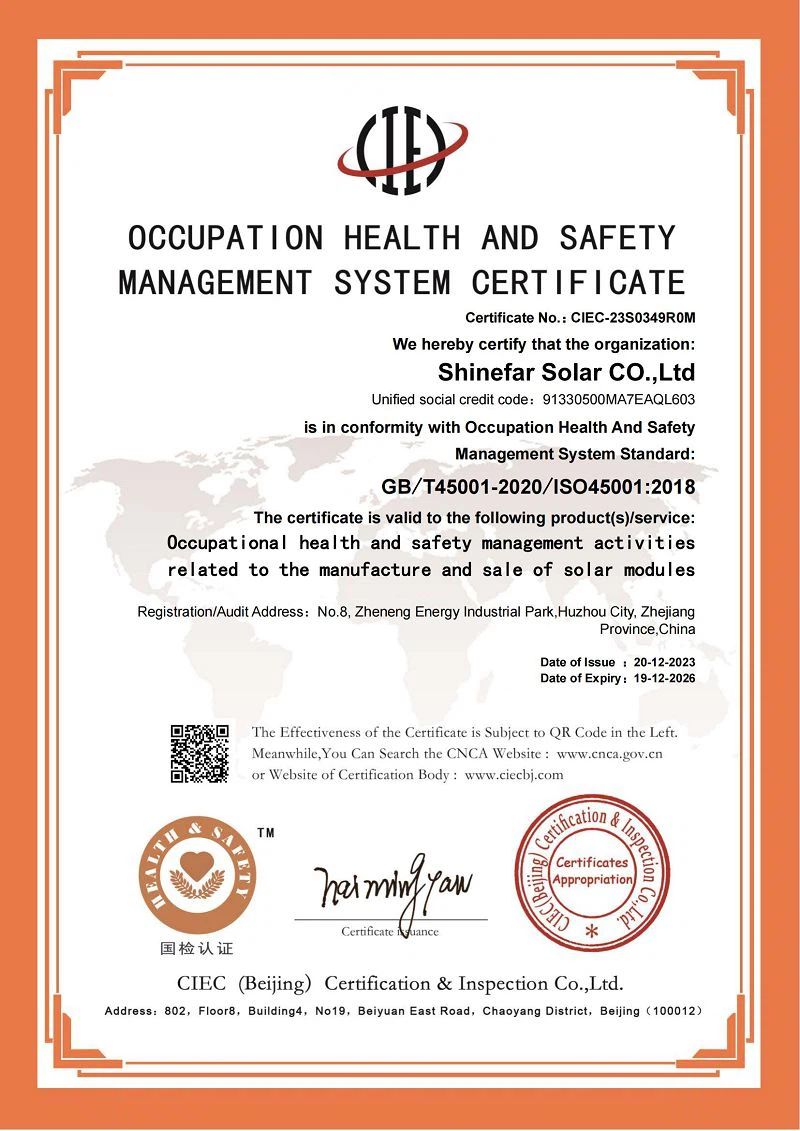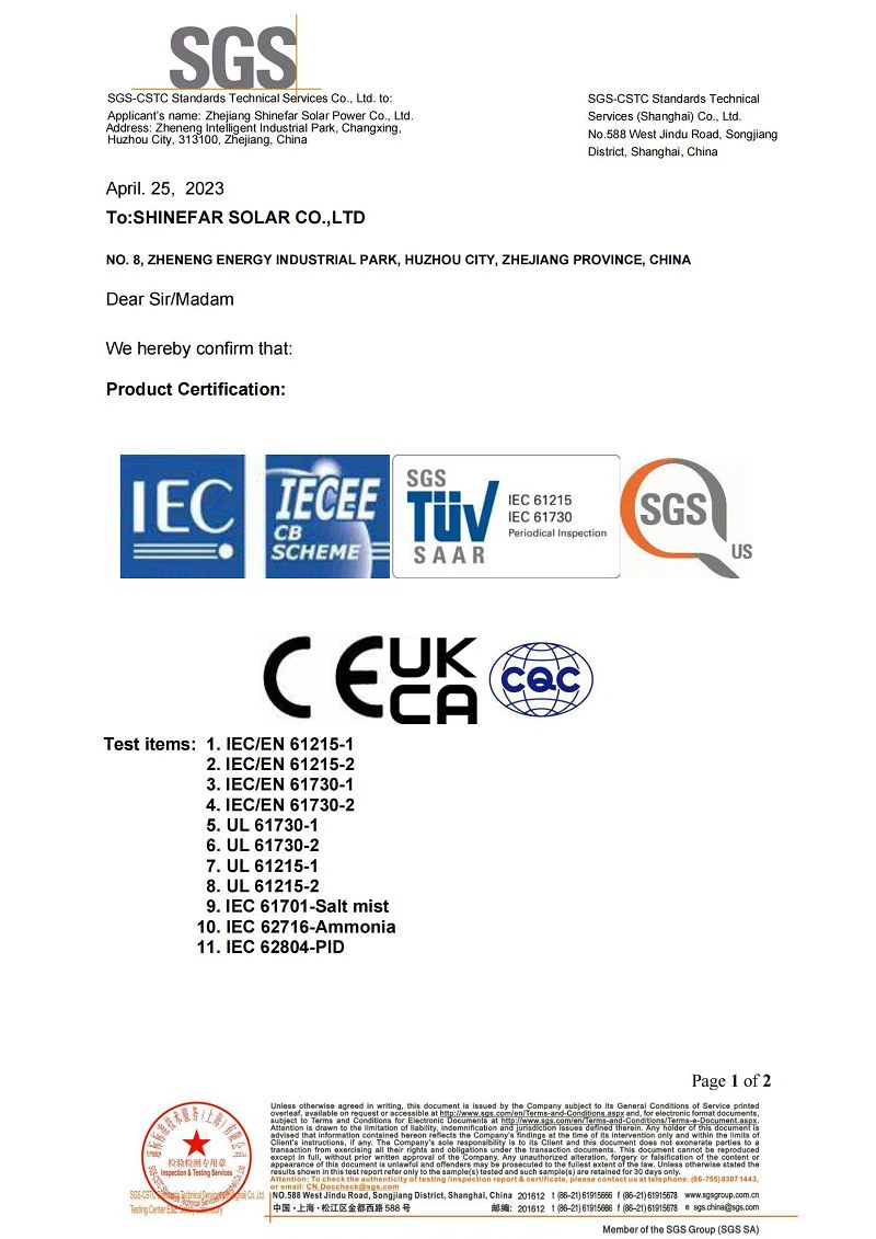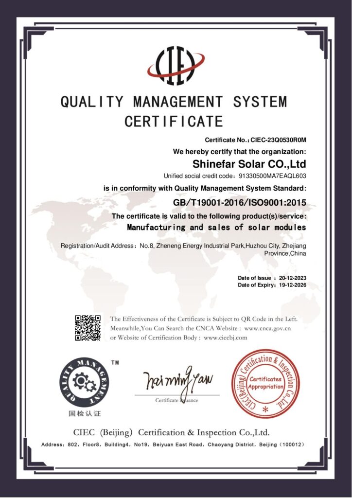 En Shinefar Solar, contamos con un equipo de técnicos altamente experimentados que impulsan nuestro éxito. Ofrecemos soluciones integrales para la construcción de proyectos fotovoltaicos conectados a la red e híbridos. Como empresa nacional de alta tecnología, galardonada con varios premios, poseemos una amplia cartera de patentes, incluyendo 5 patentes de invención y 29 patentes prácticas. Nuestro compromiso con la calidad se ve reforzado por certificaciones como IEC 61215, IEC 61730, IEC 61701, IEC 62716, IEC 62804, UKCA, UL, INMETRO y CQC.